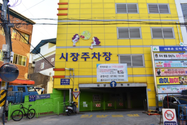 그래서인지 음식점이 있는 곳들 주변으로 주방용 소화기가 배치된 것을 확인할 수 있었어요. 그 외에도 전통시장에 조성된 다양한 편의 시설과 개선된 시장의 환경들을 체크해보았어요 우선 시장을 이용할 때 가장 먼저 보는 것은 주차장이에요.