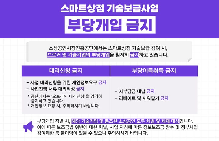스마트상점팀은 소상공인 경영효율화를 위한 스마트기술 도입을 지원하고 있으며, 지원사업 내 부당개입을 엄격히 금지하고 있습니다.